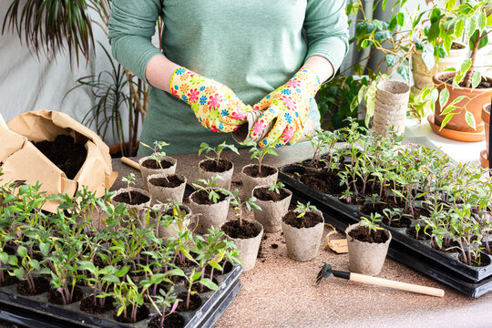 Young green seedlings of tomato in a special plastic form, woman gardener transplanting seedlings, pricking out in eco friendly pots, home hobby
