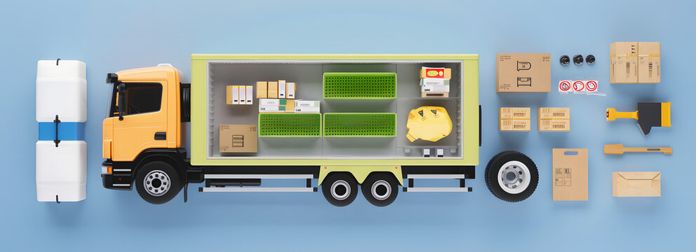 Food Safety Inspection Training. Toy truck with cargo and assorted boxes on a blue background.