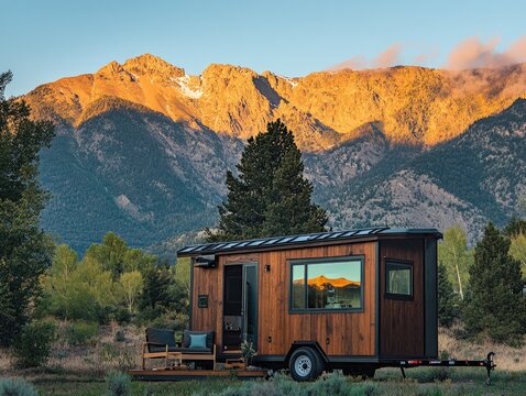 Dreamy tiny house living in the forest, showcasing a modern eco-friendly design with concrete and wood accents, perfect for sustainable living and minimalist lifestyle inspiration