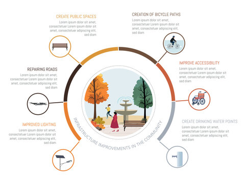 Infographic highlighting infrastructure initiatives like creating public spaces, road repairs, and lighting improvements.