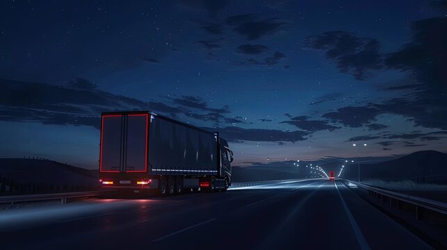 A truck driving on a highway at night with headlights illuminating the road, symbolizing the transportation and logistics industry. Ideal for themes of night driving, transport, and industry.