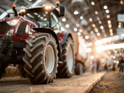 modern automotive showroom sleek car design with blurred background of visitors and lights.