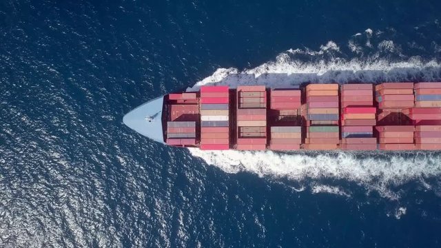 Large container ship roaring across the Mediterranean Sea - Top down aerial chase Show less