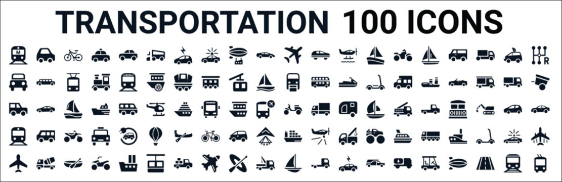 set of 100 glyph transportation web icons. filled icons such as litter car,off road,monorail,jalopy,subway,cargo ship,schooner. vector illustration