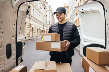 Smiling man courier in uniform standing at car trunk holding boxes preparing for delivery to a customer