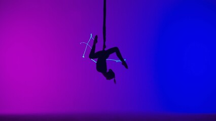 Female acrobat while presenting the show in the air on the hoop.