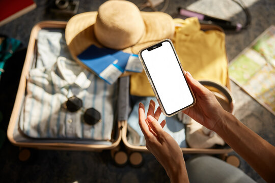 Closeup female hand holding smartphone with empty screen over travel suitcase