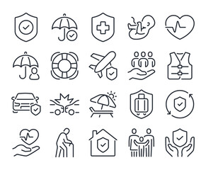 Insurance, policy, risk concept editable stroke outline icons set isolated on white background flat vector illustration. Pixel perfect. 64 x 64