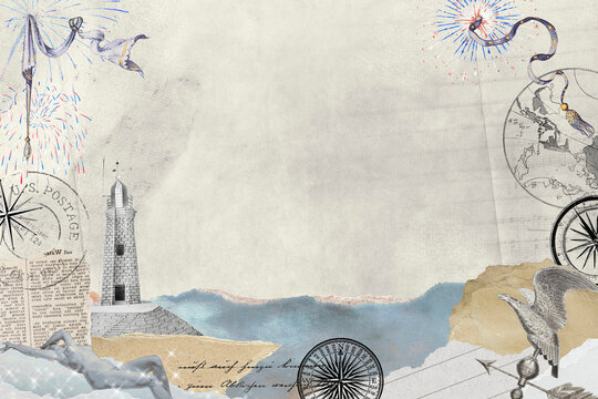Old map collage background. A concept on the topic of sea voyages, discoveries, pirates, sailors, geography, travel and history.  Pirate, travel and nautical background.