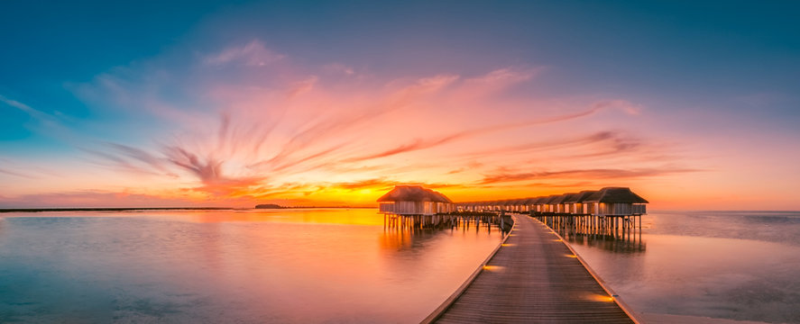 Sunset on Maldives island, luxury water villas resort and wooden pier. Beautiful sky and clouds and beach background for summer vacation holiday and travel concept