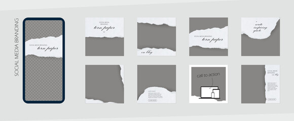 minimal Instagram social media feed branding template. ripped torn paper texture background mockup in gray nude color. for beauty, jewelry, restaurant, cosmetics, fashion content