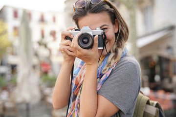 Smiling female tourist looking at her digital camera