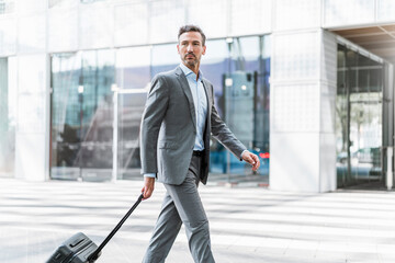 Businessman in suit walking with suitcase in urban setting