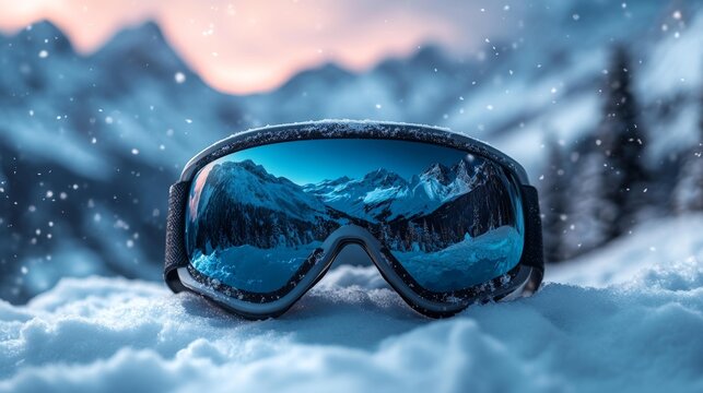 Snowboard Goggles Reflecting Snowy Mountain Peaks. Generative AI