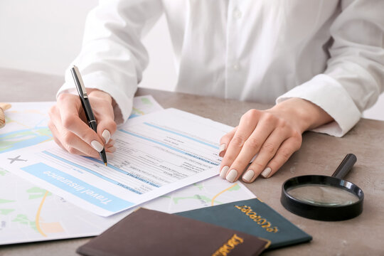 Medical tourism. Travel insurance application form, stethoscope, passport and plane model on light blue background, flat lay
