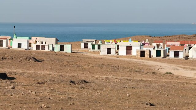 India, Daman and Diu Territory, Diu District, panoramic view of cemetery with Arabian Sea in the background