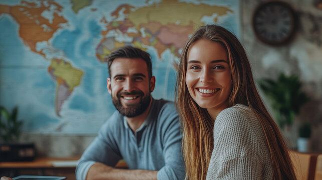 Happy young couple looking at travel destinations in a guidebook, smiling and planning a vacation adventure. Cozy library setting with world map in the background. Concept of romantic trip planning.