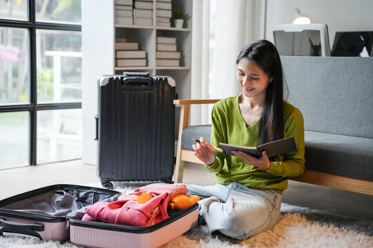 Making check list of things to pack for travel. Woman writing paper take note and packing suitcase to vacation writing paper list sitting on room, prepare clothes into luggage, Travel vacation travel