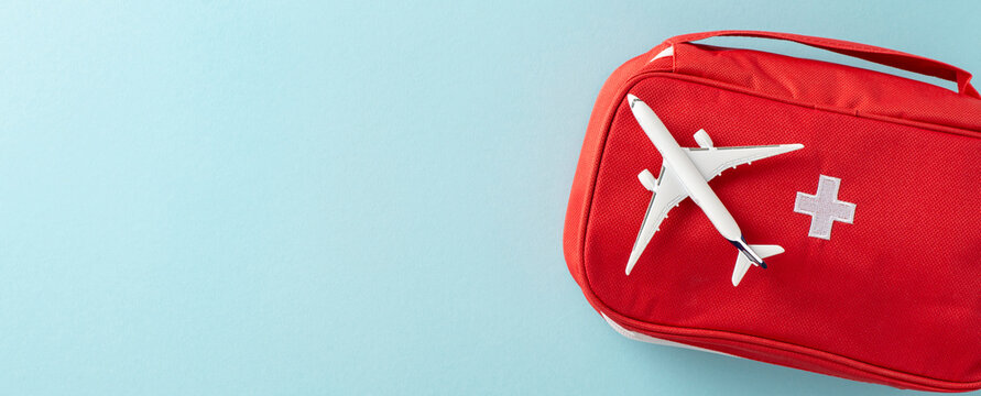 A red first aid kit placed alongside a miniature airplane, symbolizing travel safety