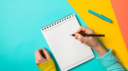 Close up shot of the person's hands writing travel tips on a minimalist notepad with colorful borders
