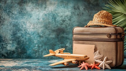 Suitcase with beach accessories travel gift voucher and wooden plane on grunge background closeup : Generative AI