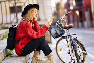 Woman wearing hat using mobile phone while sitting by bicycle on steps