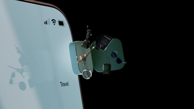 3D animation of a smartphone flying in as a travel app opens with floating travel items. Concept of trip planning, travel booking, tourism, and mobile travel services. Alpha channel.