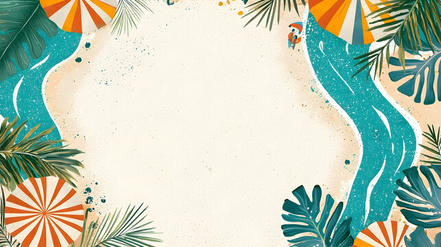 Tropical beach summer vacation design template with ocean waves, palm leaves, and umbrellas; ideal for travel brochures