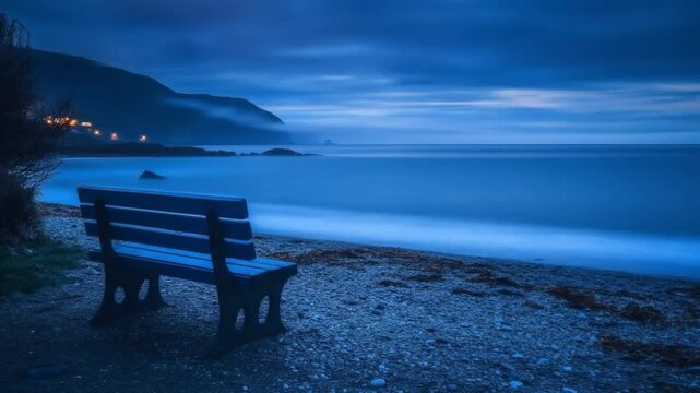 Bench overlooking ocean at dusk coastal landscape and scenic background