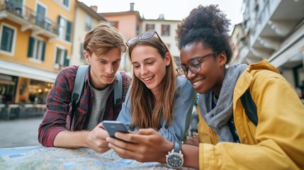 Three travelers engage with a smartphone, sharing information while enjoying their exploration. They appear to be in a lively European street, surrounded by charming buildings