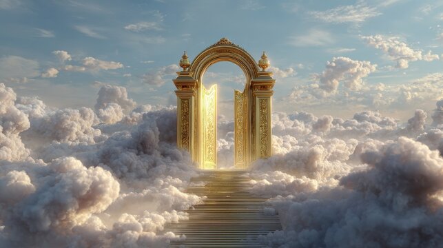 Open golden gates of paradise invite travelers into a serene landscape filled with white clouds and heavenly light