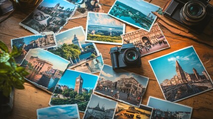 Old postcards displayed alongside digital postcards on a desk nostalgia selective focus whimsical manipulation travel lounge backdrop