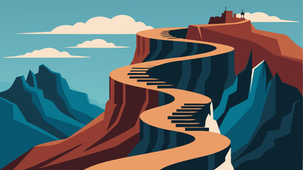 A lone hiker bravely ascends a treacherous mountain path towards a bright, cloud-filled horizon symbolizing ambition and achievement