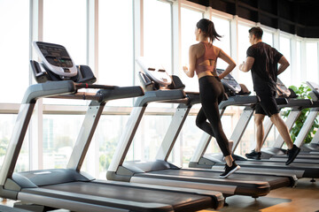Fit couple running on treadmill at gym. Sporty family doing cardio in sport club
