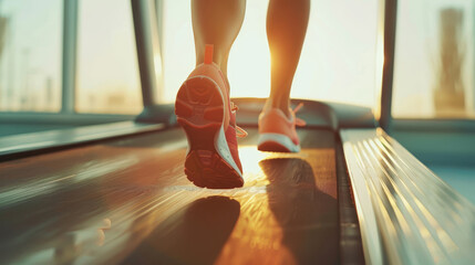 Closeup group of active fitness trainers shoes running in indoor sports gym exercising on treadmill machine. Athletes training together in jogging workout exercise leading a healthy lifestyle