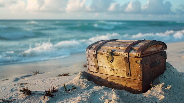 A weathered and old wooden treasure chest, half-buried in the sand on a deserted beach, with waves crashing in the background