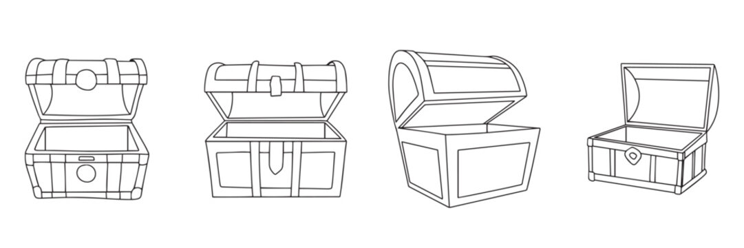 Set of open empty chest in doodle style. Outline empty treasure chests. Hand drawn vector art.