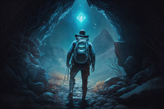 illustration painting of the explorer came to a spooky environment with diamonds, 3D illustration. (ai generated)