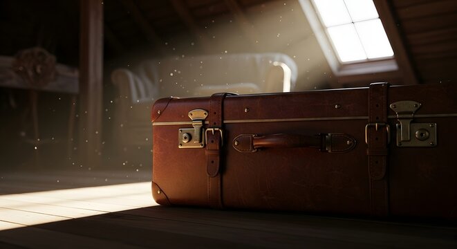 Vintage brown leather suitcase illuminated by a ray of sunlight in a dusty attic, representing a travel adventure concept and nostalgic memories