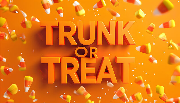3D Halloween Promotional Graphic Featuring 'Trunk or Treat' with Flying Candy Corn