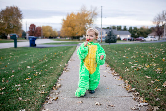 Toddler girl dressed as an alligator eating a sucker on Halloween