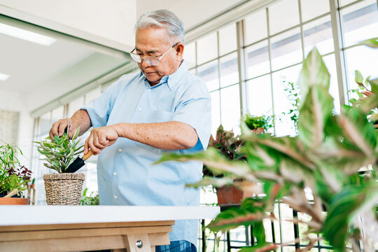 ECO concept. Close up view of the eco activists working in community allotment digging soil and planting. Woman wearing protective gloves holding plant while man planting with shovel