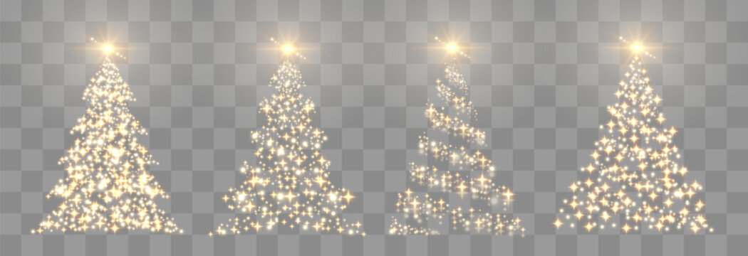 Set of shiny Christmas tree. Golden glowing spruce in a luxurious design. Glittering lights in the form of a Christmas tree with bright shining and glowing particles. Vector on png background.