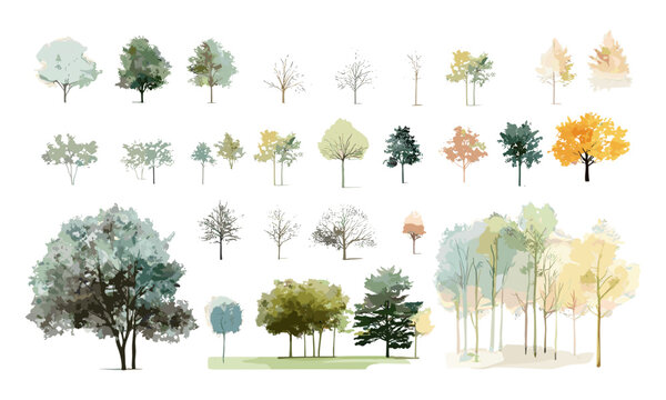 Green painting of trees, vector illustration, watercolor tree set, tropical, oak, maple, poplar, stroke fill, side view elements, forest symbol, clipart for landscape use.