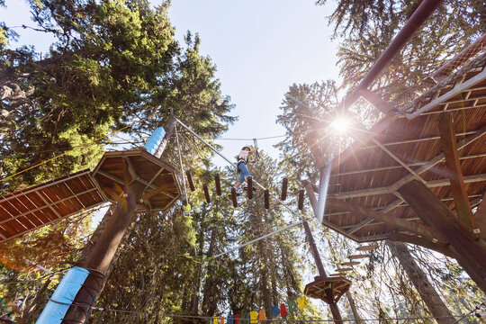 Girl on aerial ropes course platform in treetop adventure park