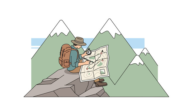 Adventurer Sitting on Rock Looking at Map While Hiking in Mountains Illustration