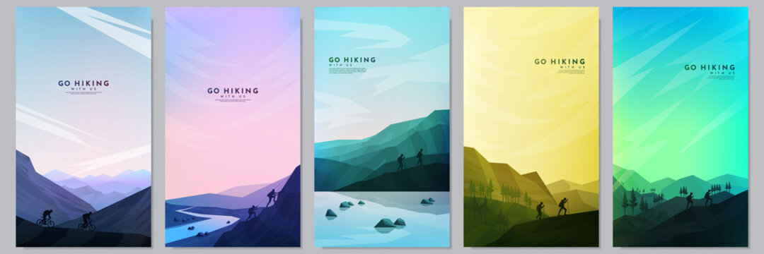 Vector illustration. Travel concept of discovering, exploring and observing nature. Hiking. Adventure tourism. Minimalist graphic flyers. Polygonal flat design for gift voucher, coupon, wallpapers