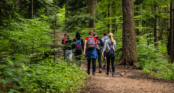 Hikers walking on a trail through the Amazon rainforest on a sunny day, carrying backpacks and using trekking poles