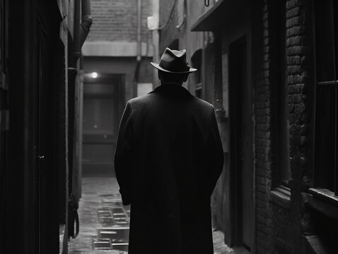 Silhouetted figure in fedora and overcoat walks dark brick alleyway at night