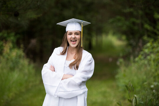 Laughing Female Graduate Wearing White Cap With Tassel and Gown